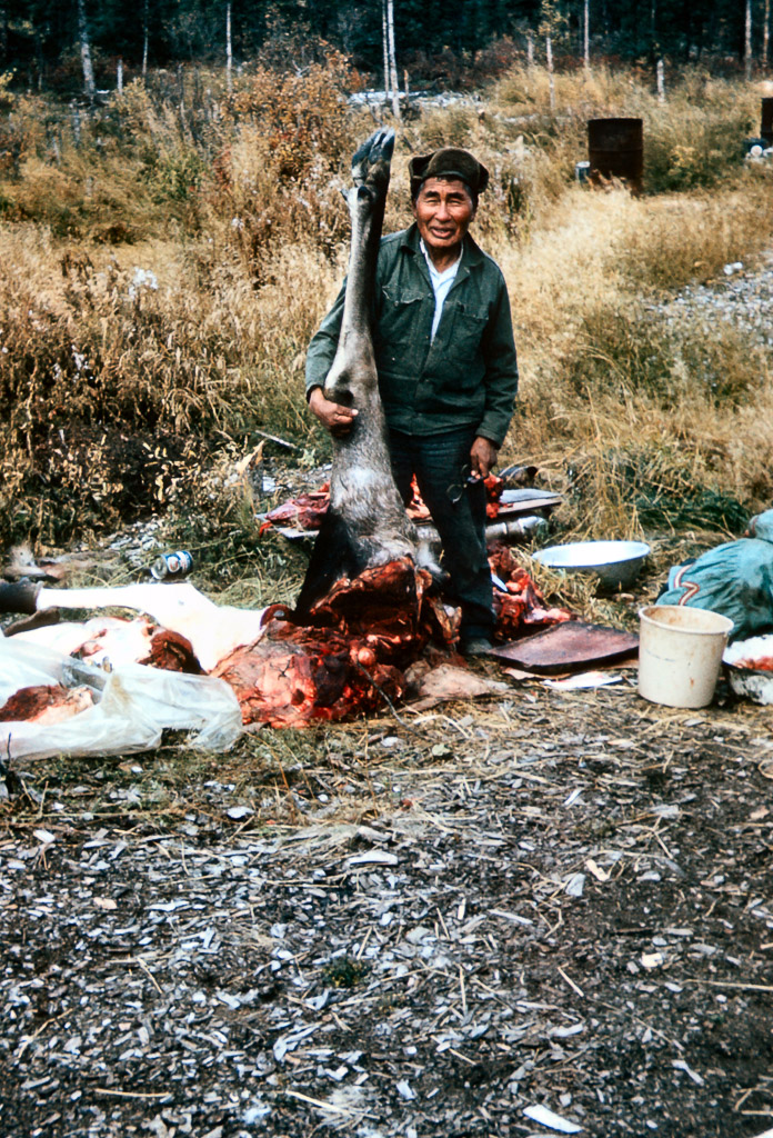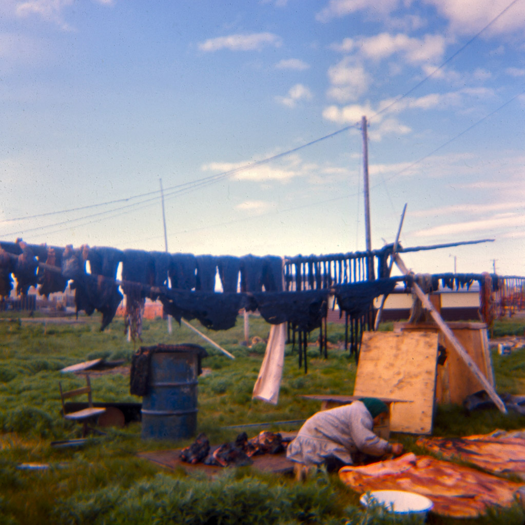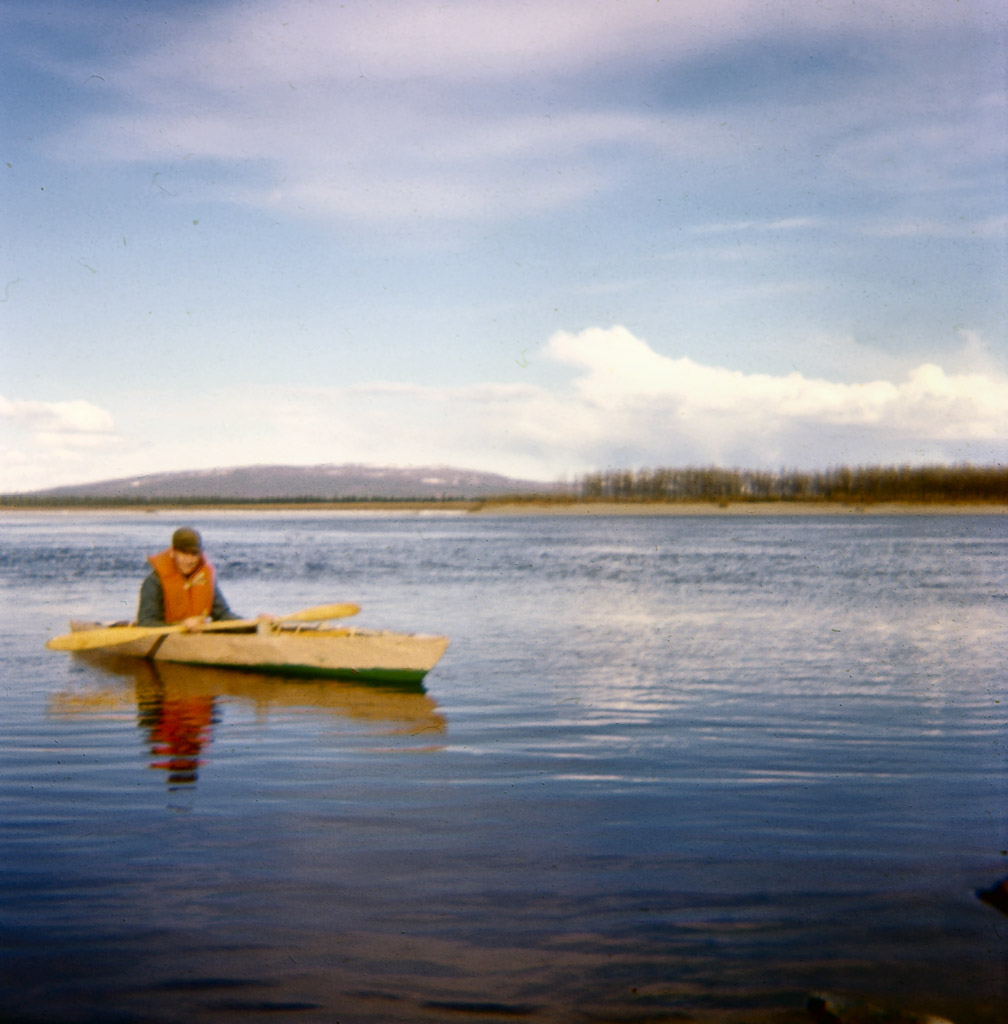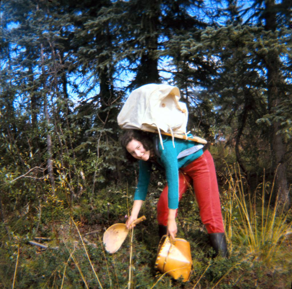 1969 Dorene picking blueberries. Birch bark basket Dorene made, spruce root calutuk made by Oliver, pack made by Dorene.