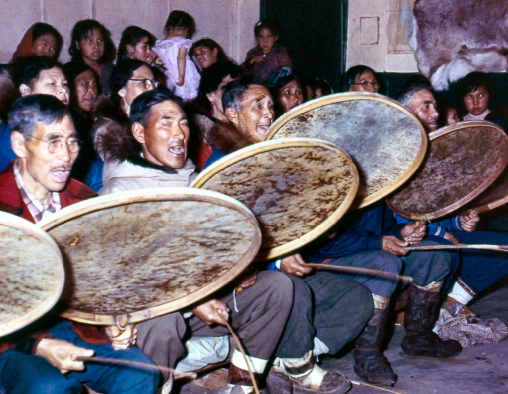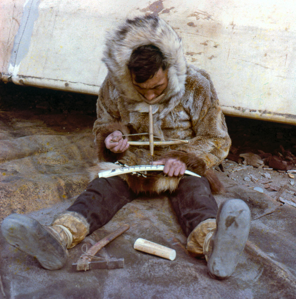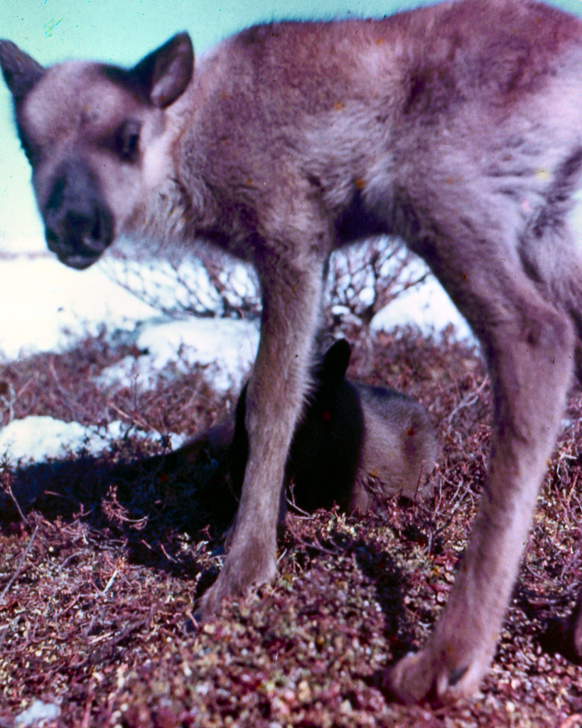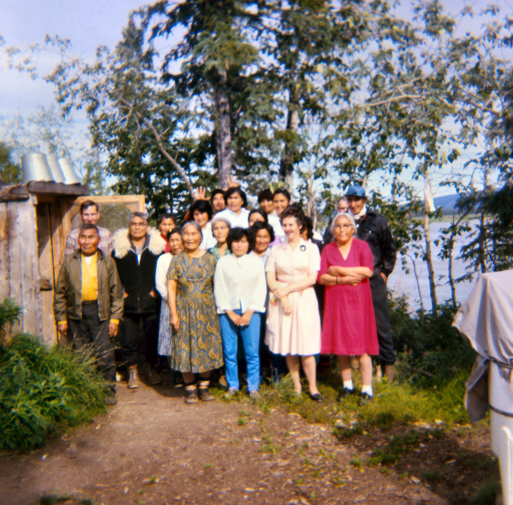 1969 Dorene picking blueberries. Birch bark basket Dorene made, spruce root calutuk made by Oliver, pack made by Dorene.