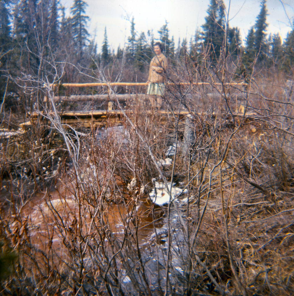 1960s Lorene on bridge Oliver built across our creek This was the trail to town.