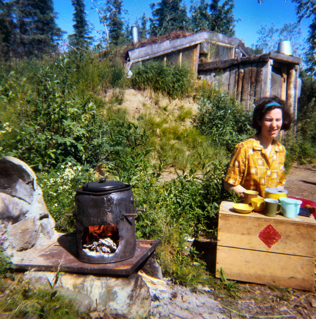 1969 Dorene cooking breakfast. Outdoor stove in front of our house. Using Blazo box as a table.
