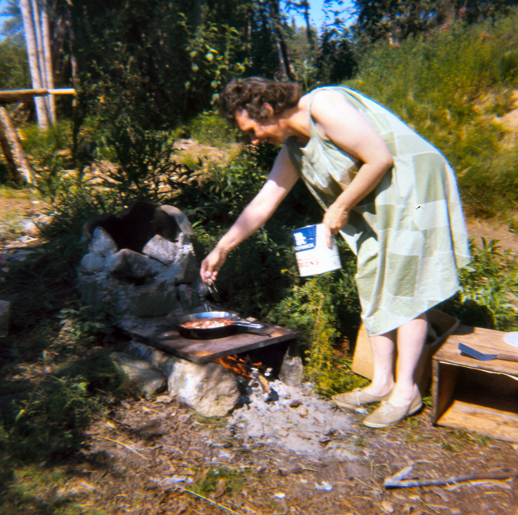 1969 Mama Lorene cooking breakfast on outdoor stove.