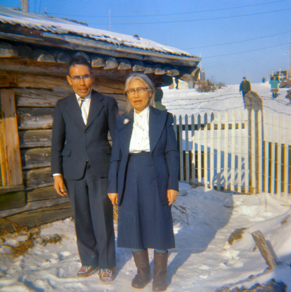 1967? Lorene in parka mukluks and wolf head mittens near our house.