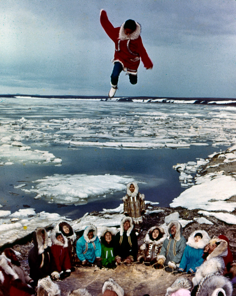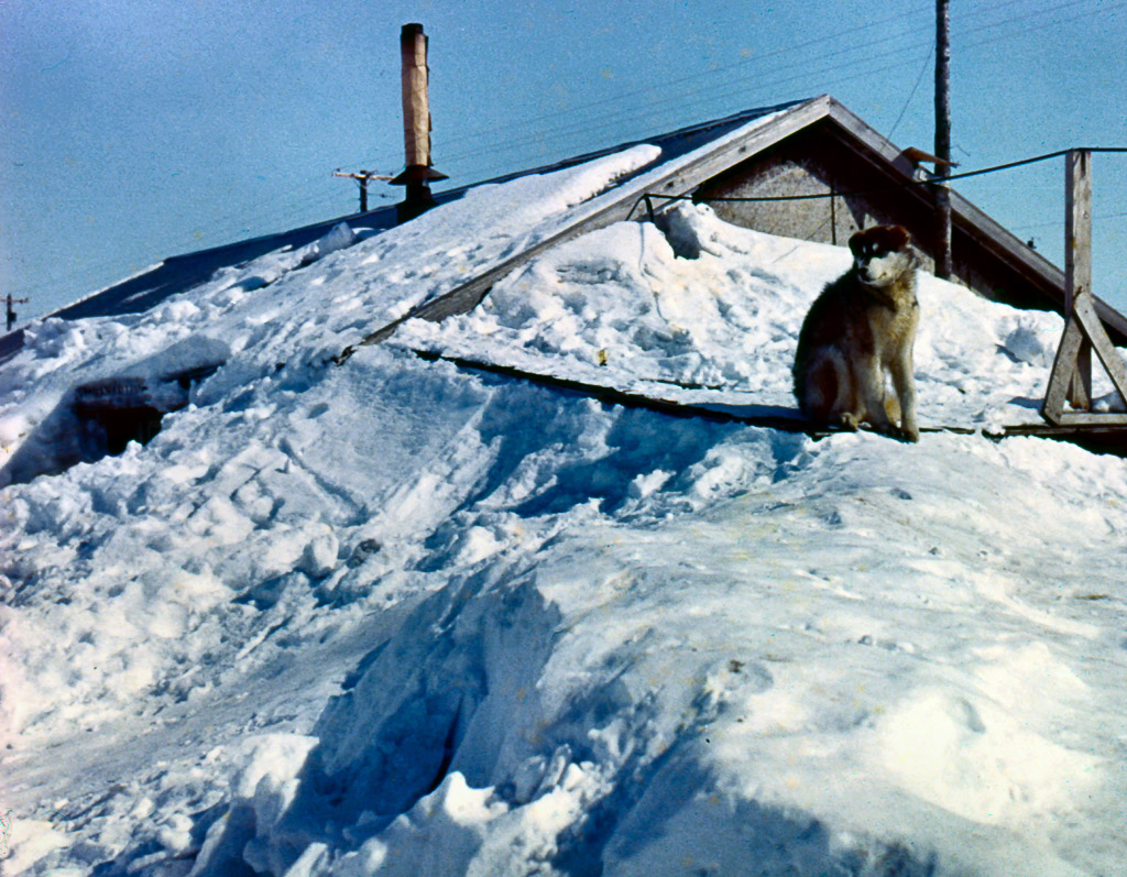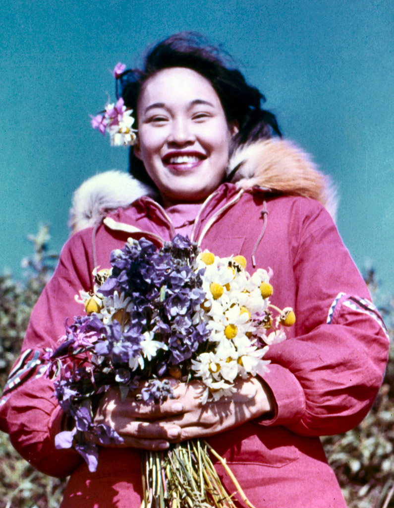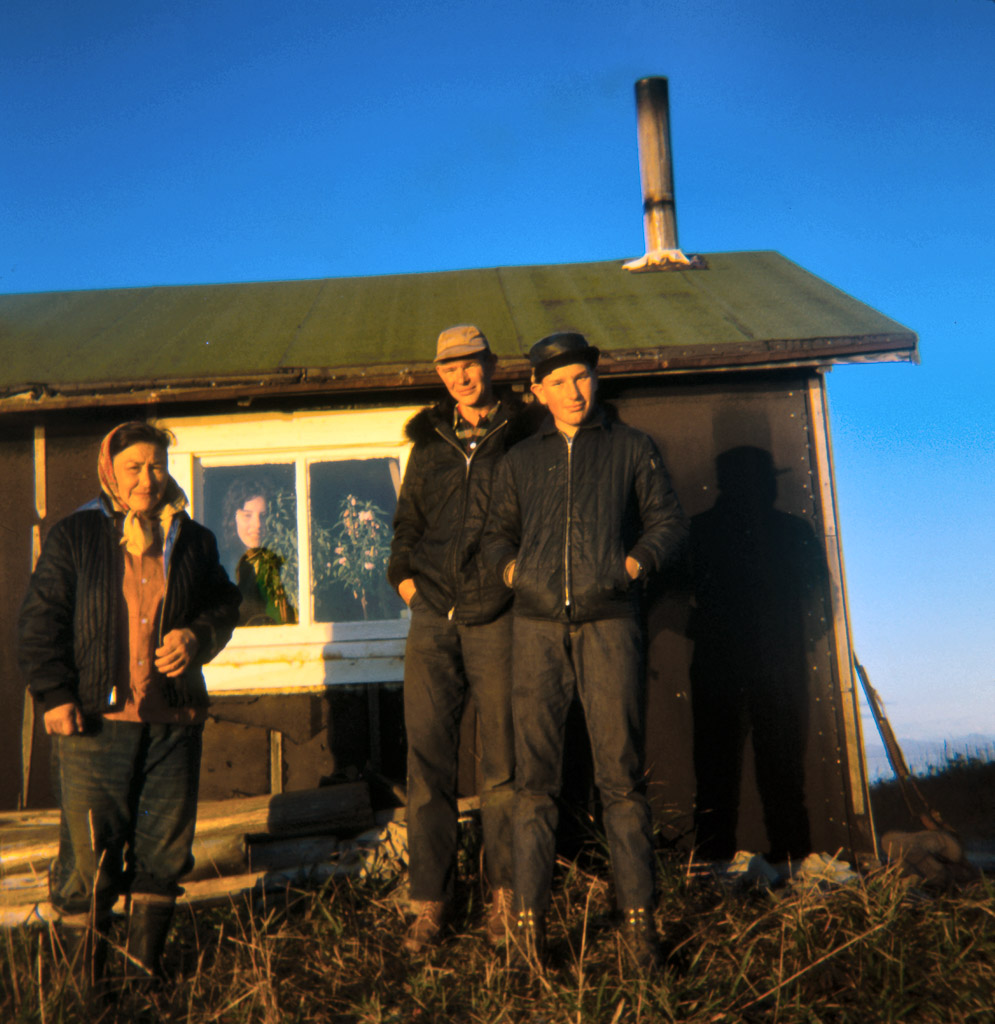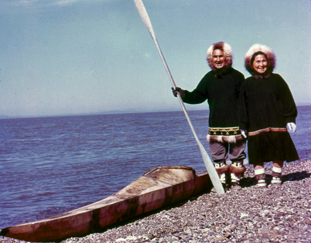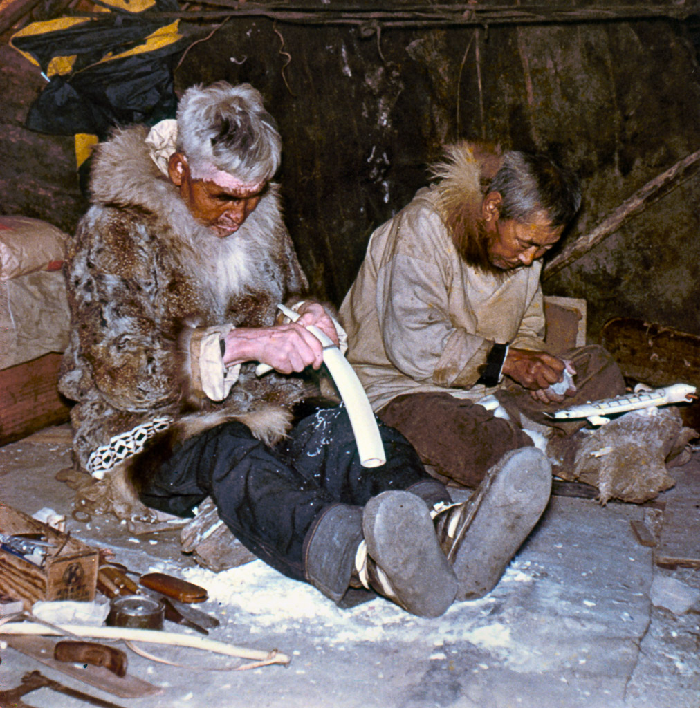 1950s Carving ivory. Kotzebue, AK. Wearing beaver skin parka with wolf ruff. Ruffon right is wolverine skin.