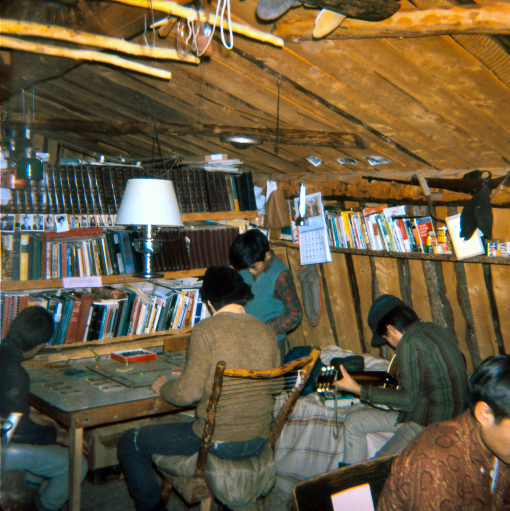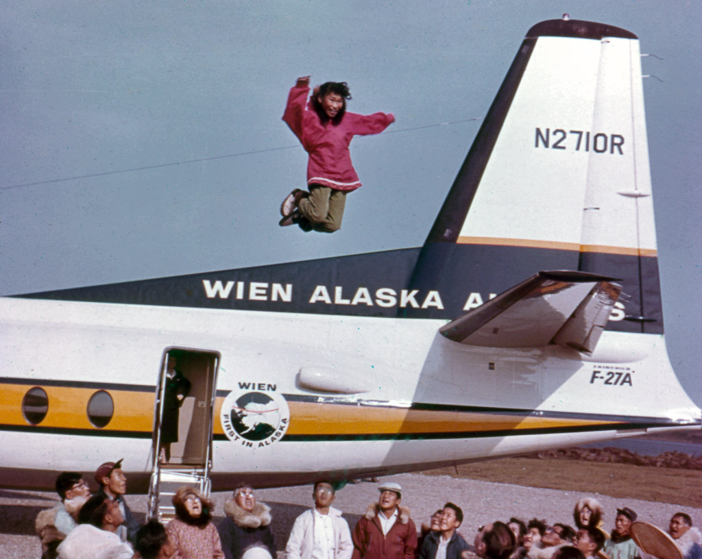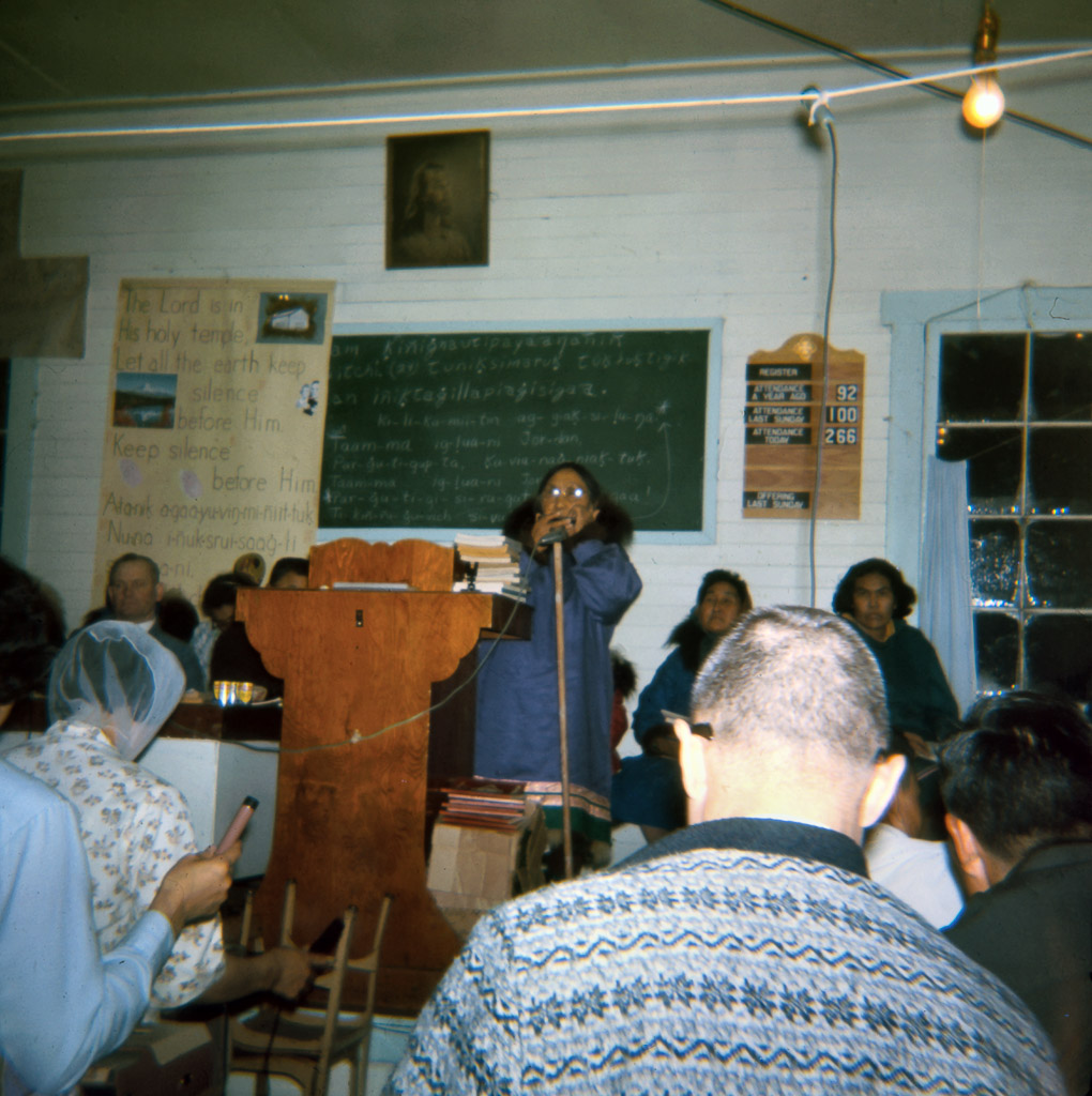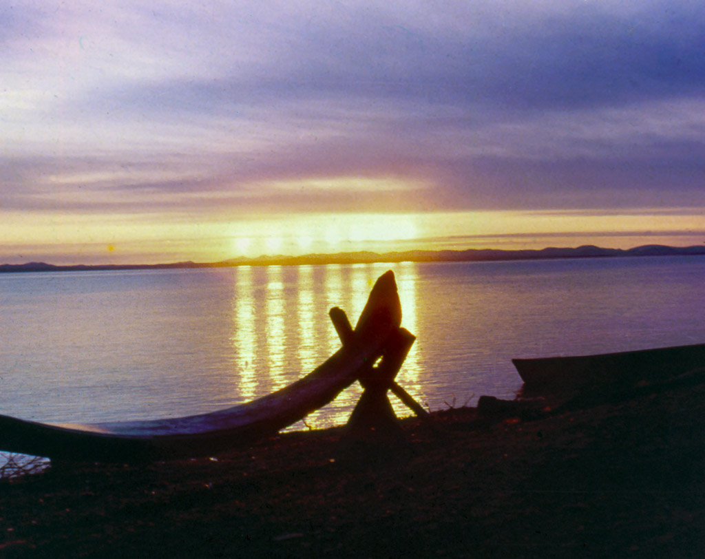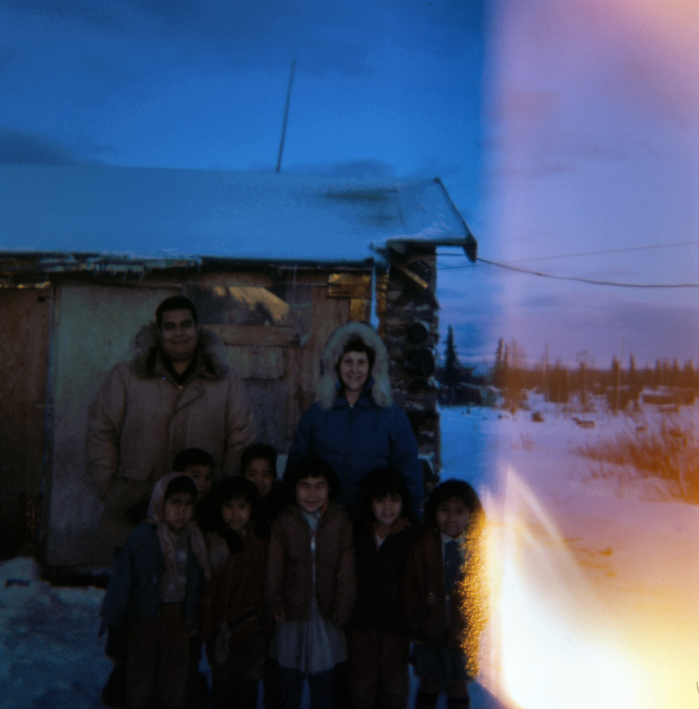 1950s Carving ivory. Kotzebue, AK. Wearing beaver skin parka with wolf ruff. Ruffon right is wolverine skin.