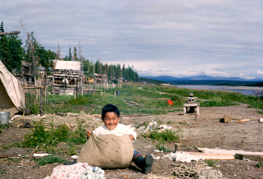 Joe Cleveland, Catherine Cleveland's son playing in the net repair area on the beach in front of Ambler. Fish racks down by the river, fenced garden and cache on the left. Also an wall tent. with the flap thrown open. A small outboard motor on a stand.