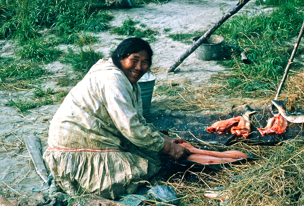 Maude Foxglove in typical summer dress, using an ulu to cut chum salmon to dry.