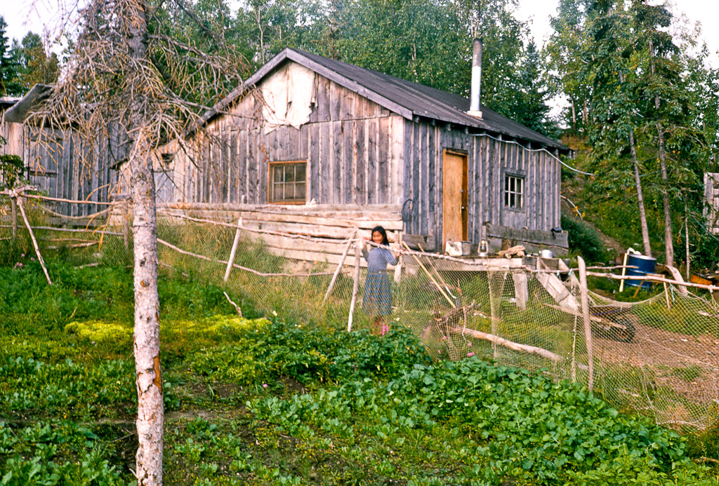 Mamie Cleveland with gathered birch bark for basket making. Birch Bark is stored in the siglok (storage cache).