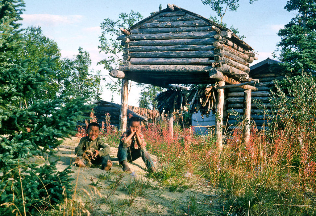 Cabin built with vertical split poles, cache with ladder, firewood rounds in the yard