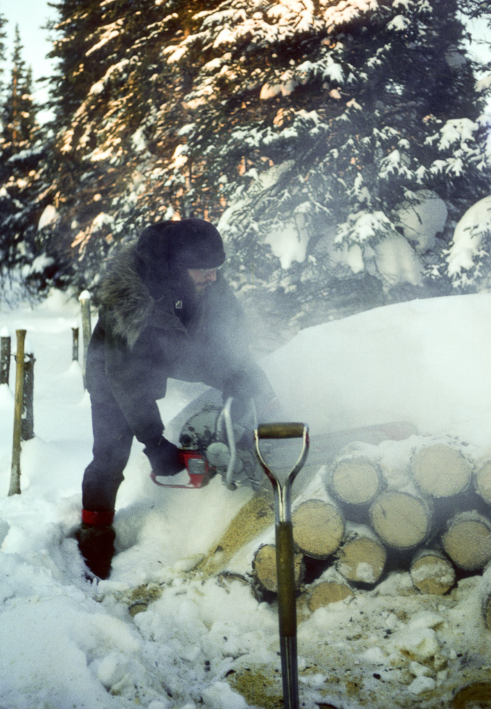 Dan cutting firewood with a chainsaw