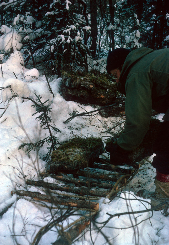 Dan Denslow placing frozen blocks of sod on a two person carrier to move it
