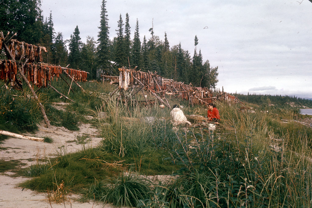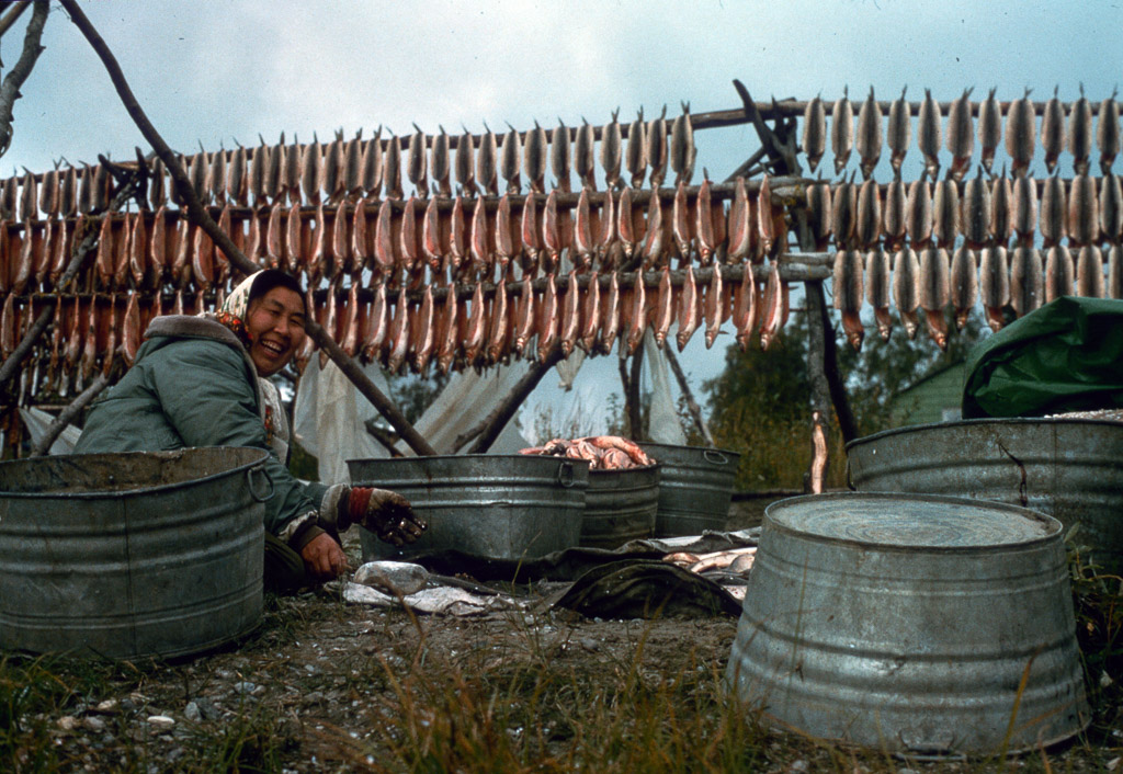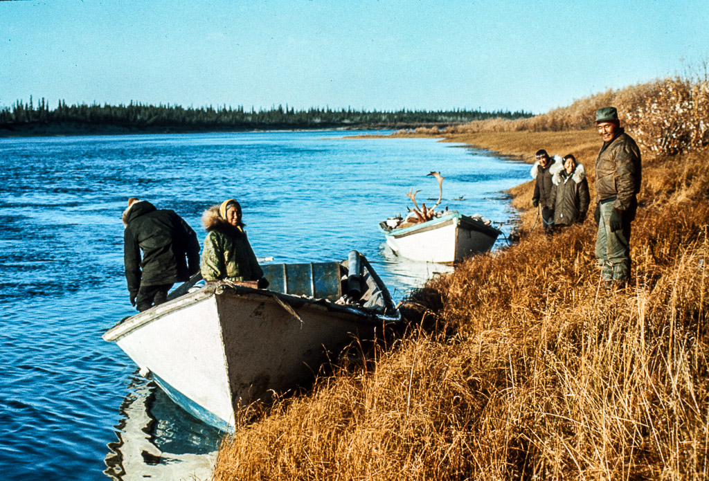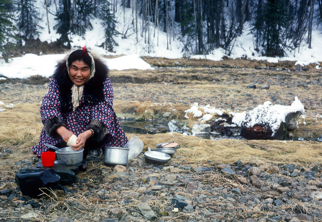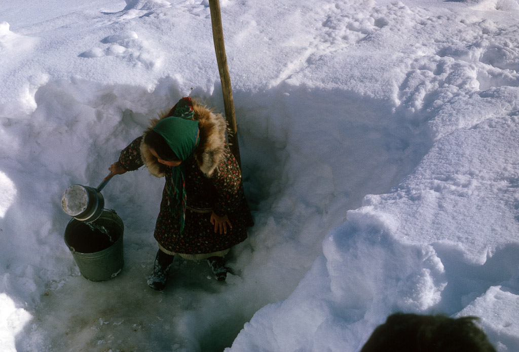 filling a water bucket from a water hole, Kobuk River. Dora Douglas, a tuk is behind her standing upright.
