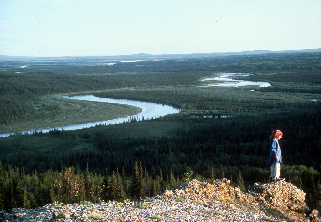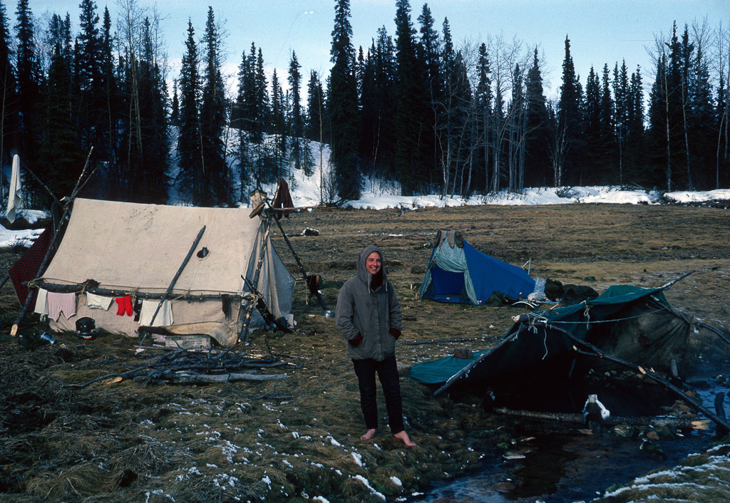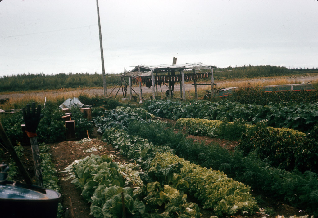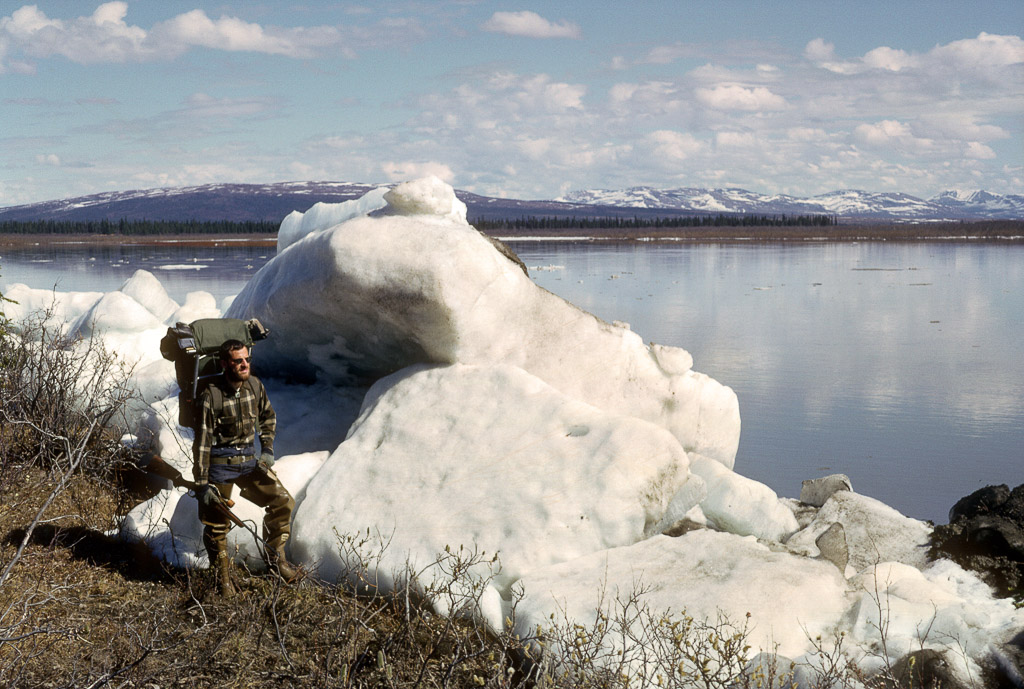 filling a water bucket from a water hole, Kobuk River. Dora Douglas, a tuk is behind her standing upright.
