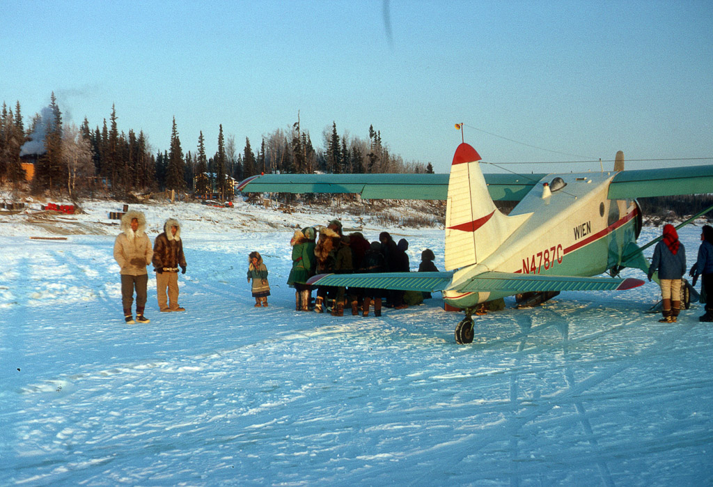Meeting the Wien mail plane landed on the frozen river in front of Ambler, a highlight of the week for which many turned out. Mark Cleveland is second from left.
