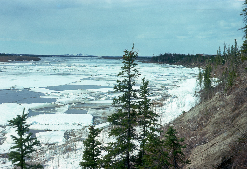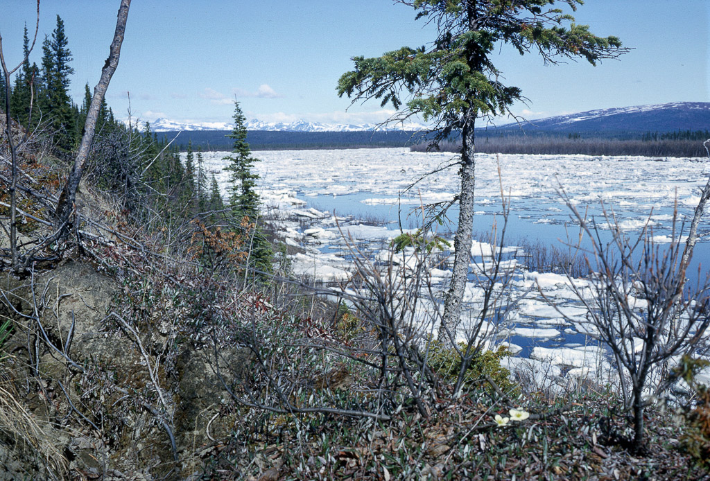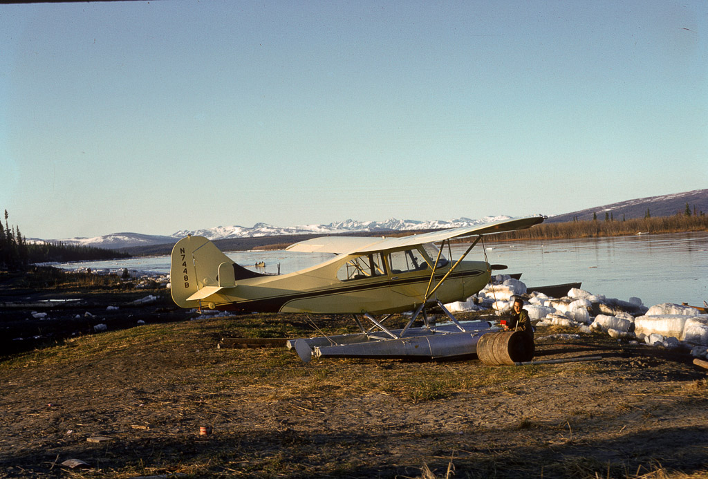 airplane on floats, Joyce tying down the plane to a drum at river's edge just after break up