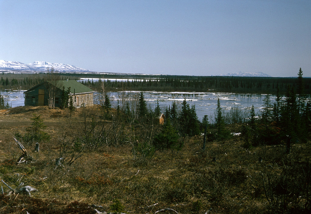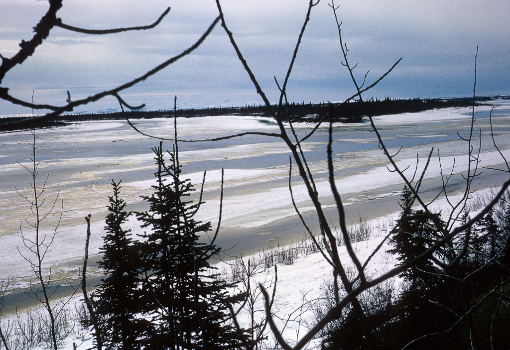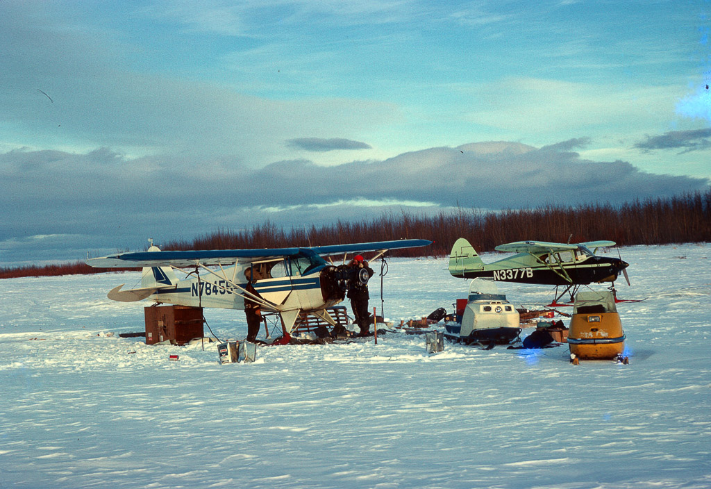 Dan Denslow's second airplane on the left, and one other tied down on the frozen river. Two snow machines near by.