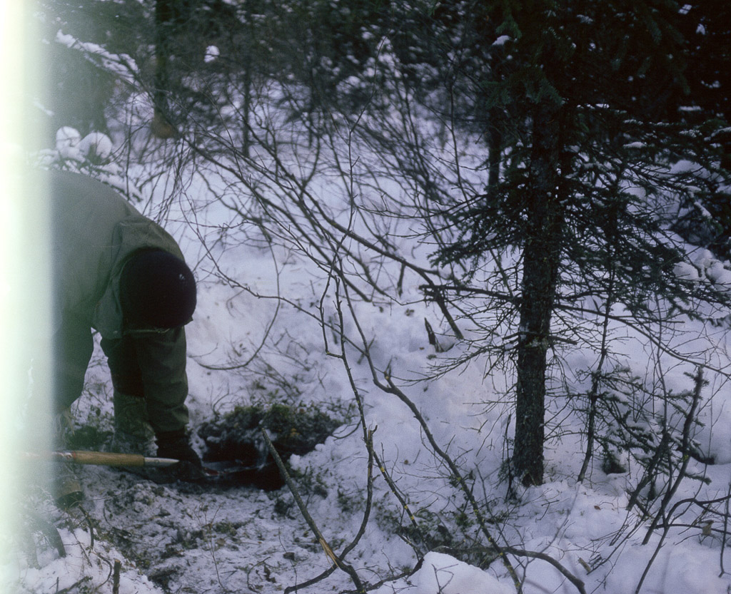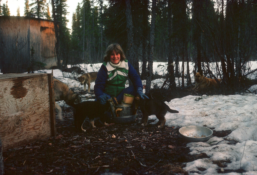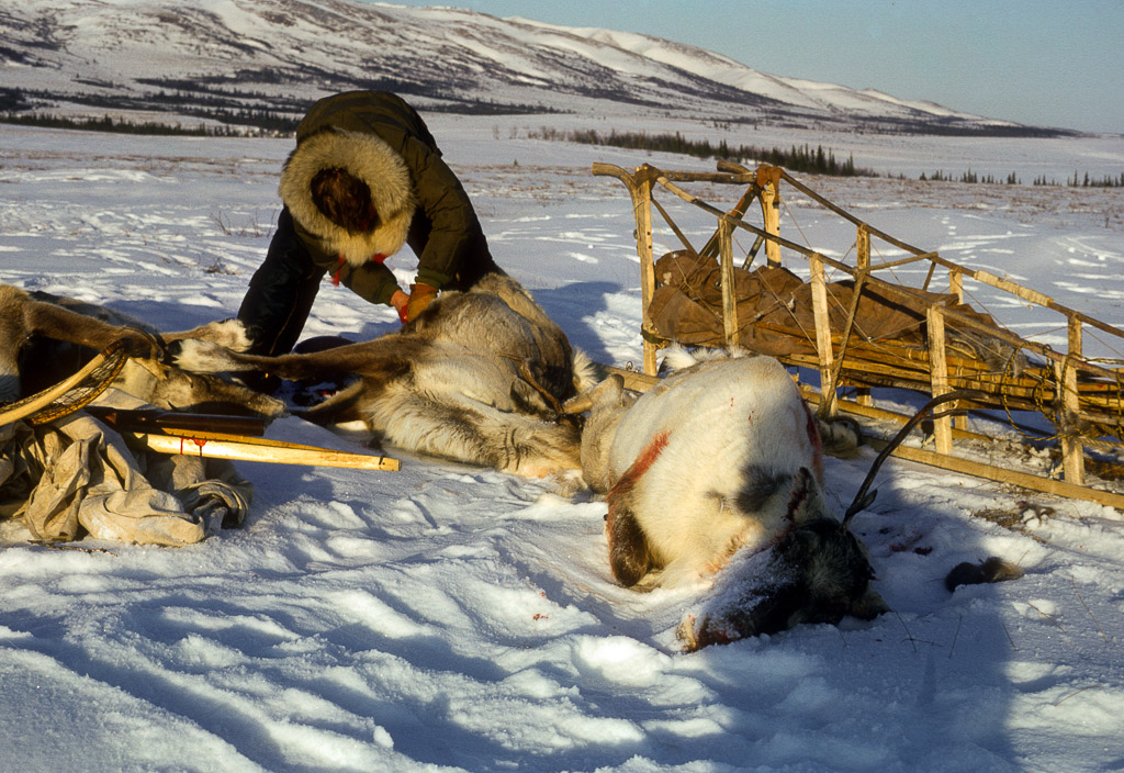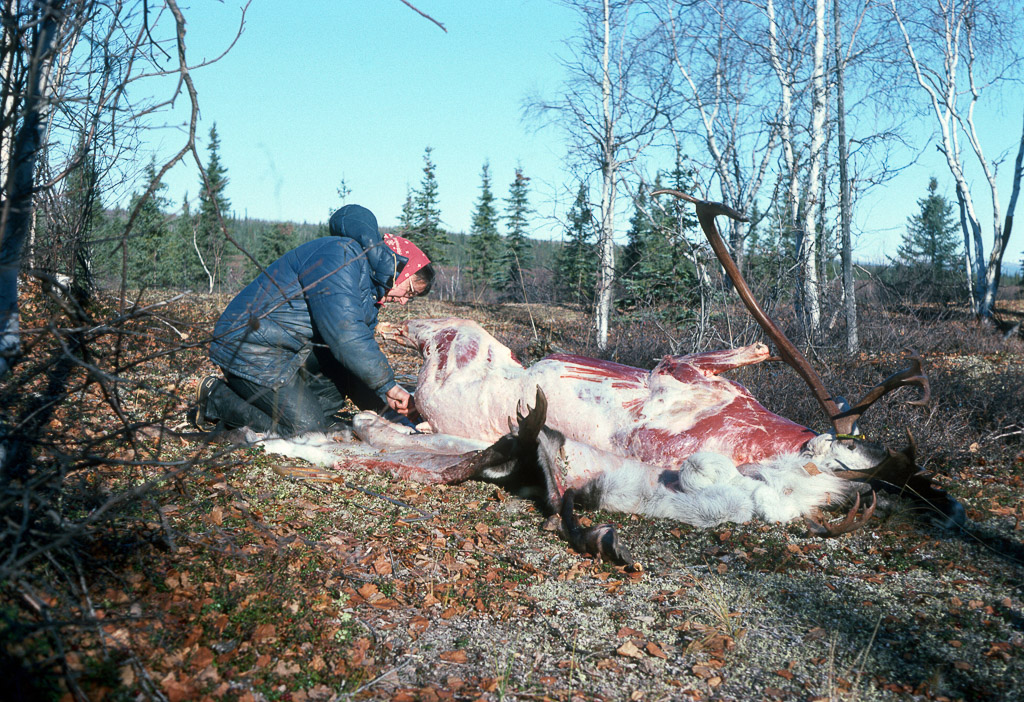 Freshly hunted caribou being butchered to cool and be taken back home by dog sled. from Joyce