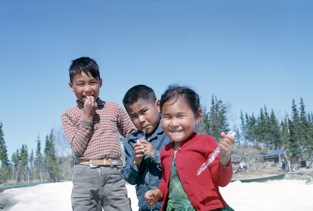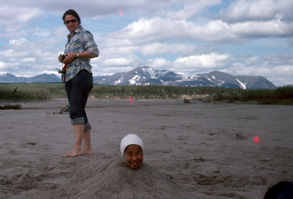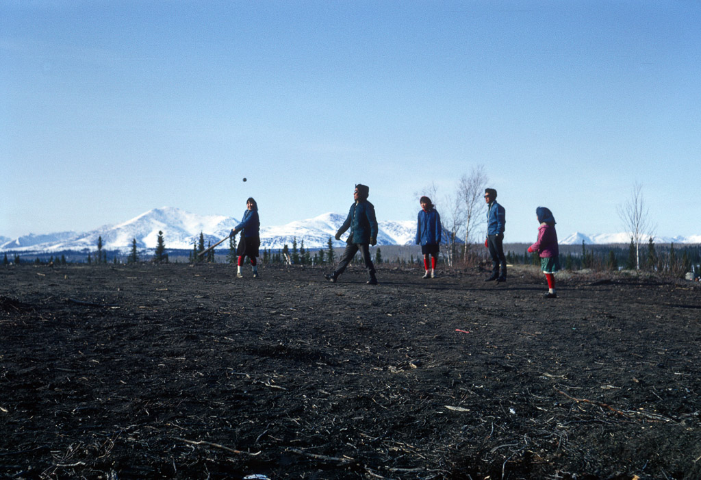 Playing Munumanha on the old Ambler airstrip just above the church in Ambler. Often played late into the night during the summer light. Mabel Cleveland is at bat.