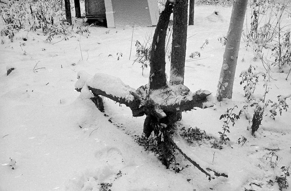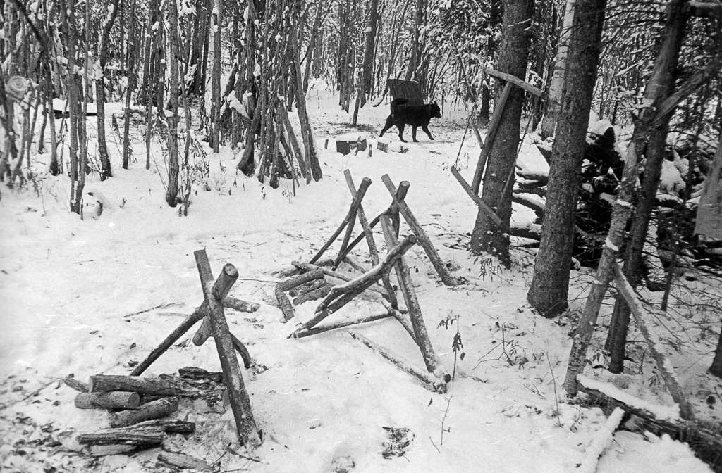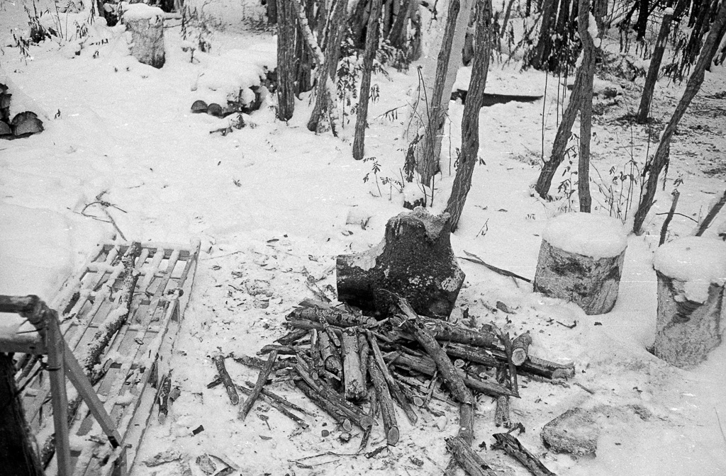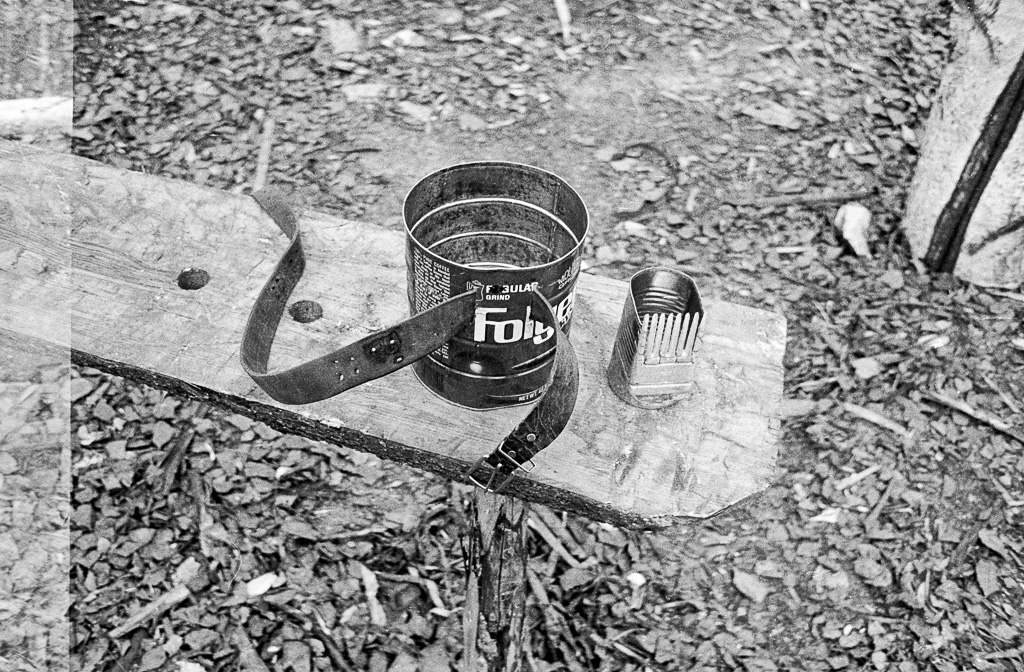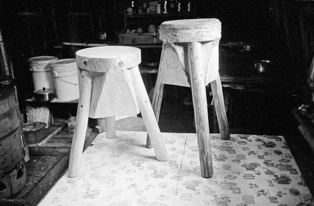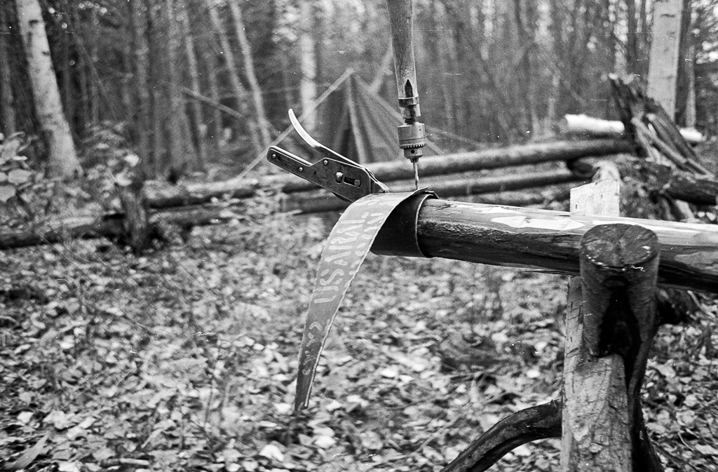 Photos » Make-it projects & tools, 1978 Courtesy of Curt Madison Three legged stools a stump used to hold firewood while cutting it up, also a sled berry can to wear on a waist belt for easily depositing the berries as they are picked, also berry rake next to it Tree covered in snow, with potential for building Tripod sawhorses made from forked poles, also a folding saw hanging in a triee A three legged work bench, a metal dril with hand made handle ◄ 1 2 3