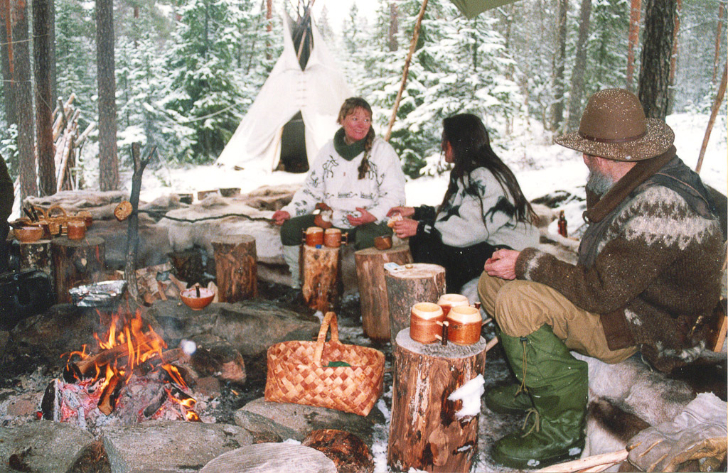 Oliver, Heidi and one other sitting around campfire. Teepee in background. Norway