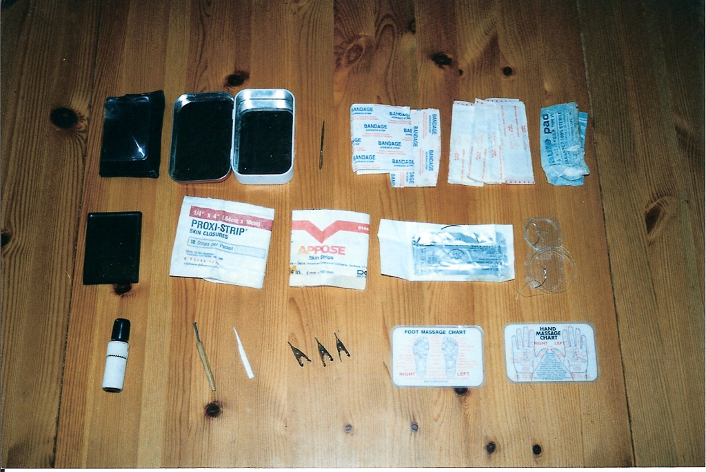 Here is some pictures I took of Olivers firstaid kitt in 2000. There you can see the curved threaded needles for suturing. In this little green pocket he had a bottle of Iodine and other firstaid things. He used the foot massage chart on me on my friends for health ptoblems. He also wanted to massage Mikkels feet when he was a baby in Alaska. Sent by email from Heidi 9-4-2012